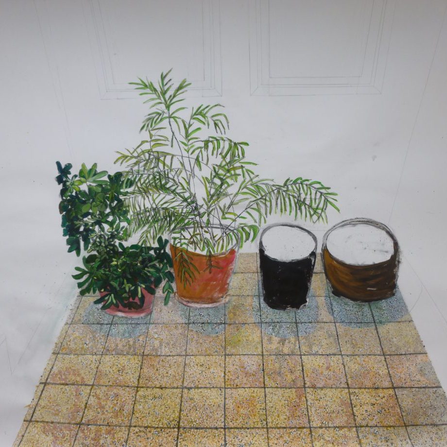 Het eerste werk na de Nau, wordt een remake van een eerder gemaakt werk van een halletje in een kloosterachtig hotel in Keulen. Het werk is nu veel groter, de tegels waarin je allerlei vormen kan zien, de planten die groeien tegen de verdrukking in. Met deze maat kun je er echt inkijken. Alsof je […]Read Post ›